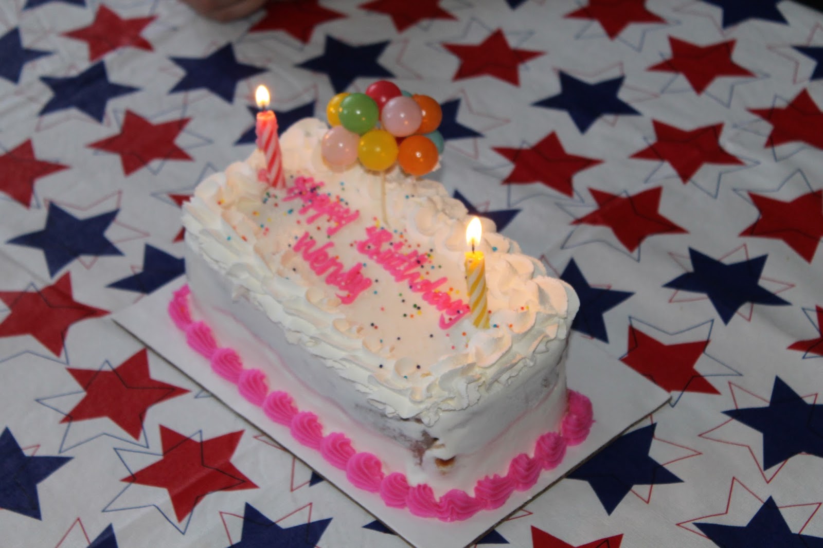 Birthday cake for Wendy but shared with Tim. [Note the two candles.]