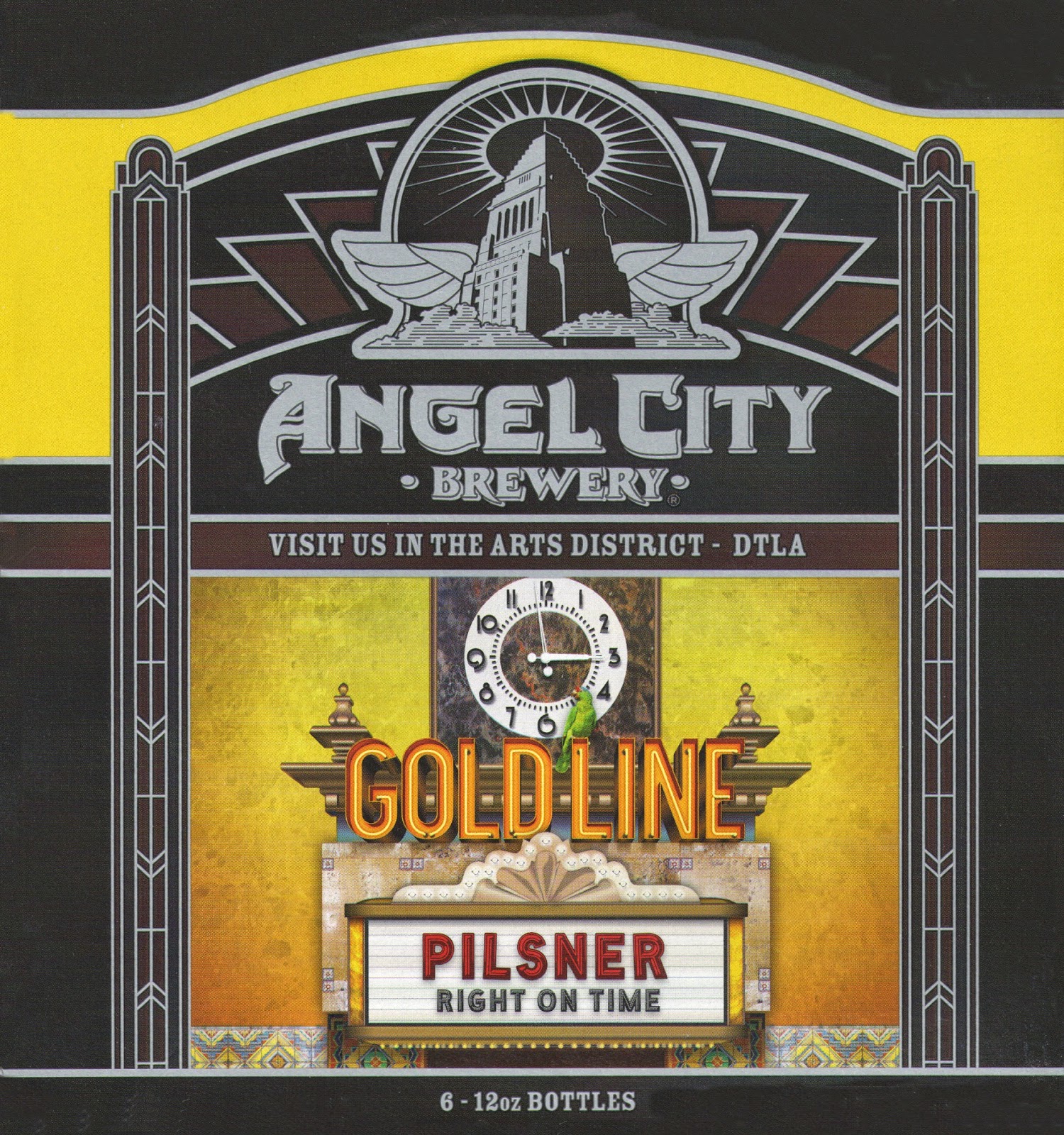 Carton for Angel City Brewery Gold Line Pilsner. Gold Line is the MatroRail line that stops very near the brewery in #DTLA; the art is a replica of Union Station (bottom) and L.A. City Hall (top).