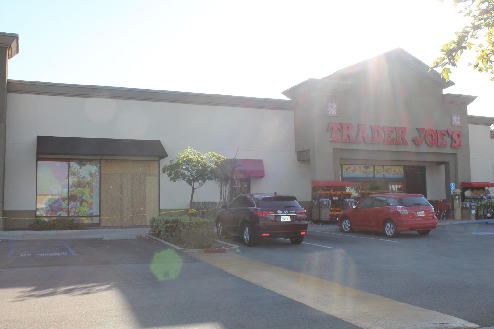 A Party City store in San Dimas, CA, was crashed into on Halloween afternoon, Saturday, October 31, 2015. I shop at the Trader Joe's next door every Sunday morning. Trader Joe's employee Chris, with whom I spoke the following morning, told me that she had been on duty at the time of the crash and that the walls shook violently. She said that two Party City customers who had been in the store at the time of the crash came into Trader Joe's afterward and appeared uninjured but visibly shaken. I took this photo Sunday, November 1, 2015, at about 8:15 a.m.